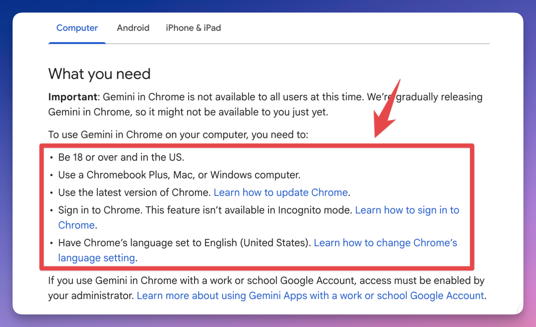 根据谷歌官方的 FAQ 文档,使用 Gemini in Chrome 需要满足这些条件。