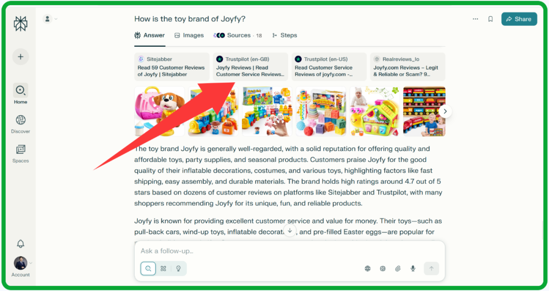 随后,被Perplexity引用并作为依据向用户展示。关于SERP搜索展现技巧,请阅读相关文章,获取方法: