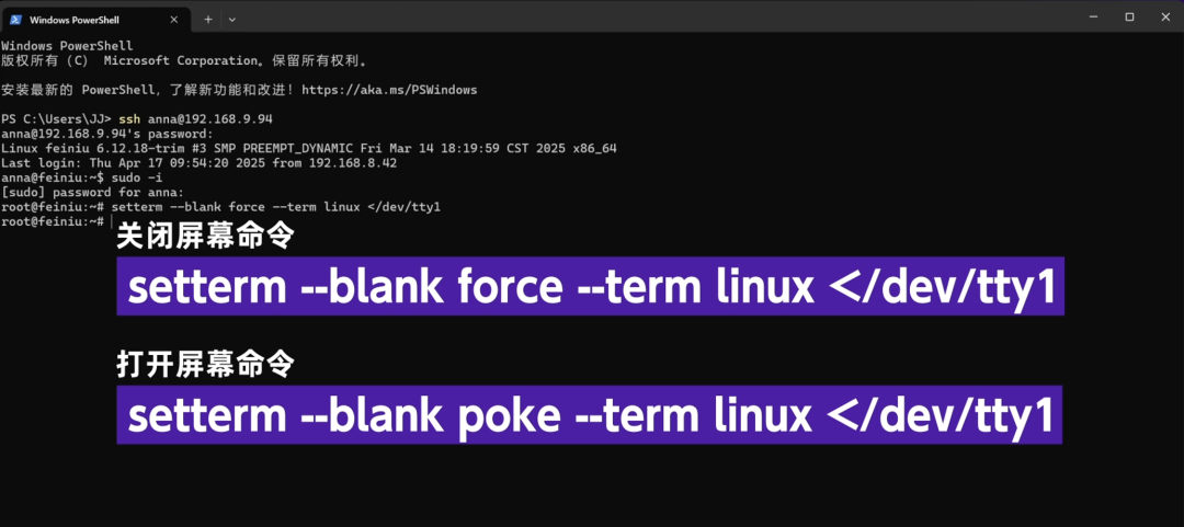 然后继续输入 sudo -i,进入管理员模式,接下来就可以使用下面的命令开关屏幕啦!