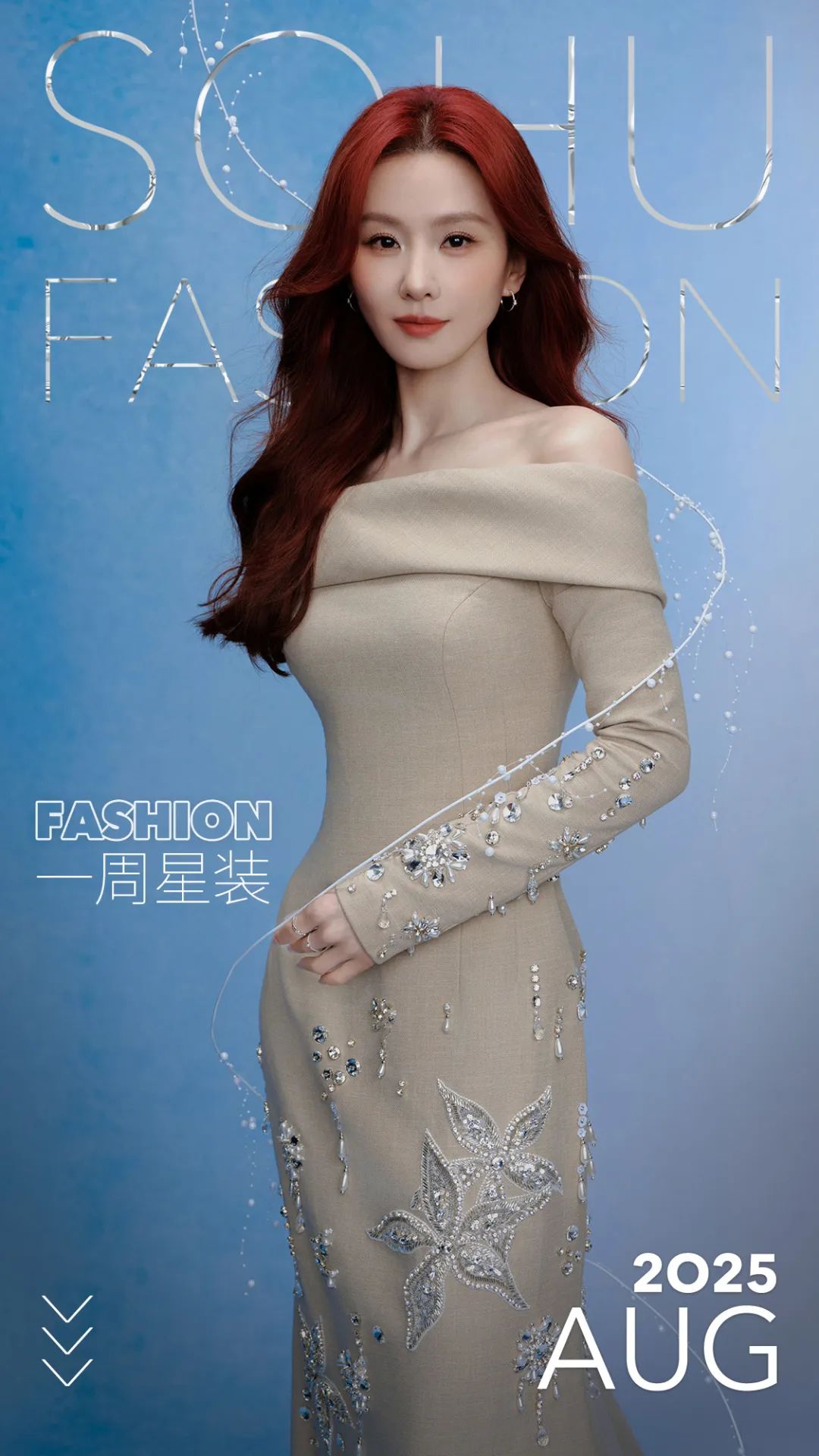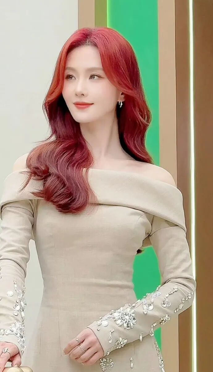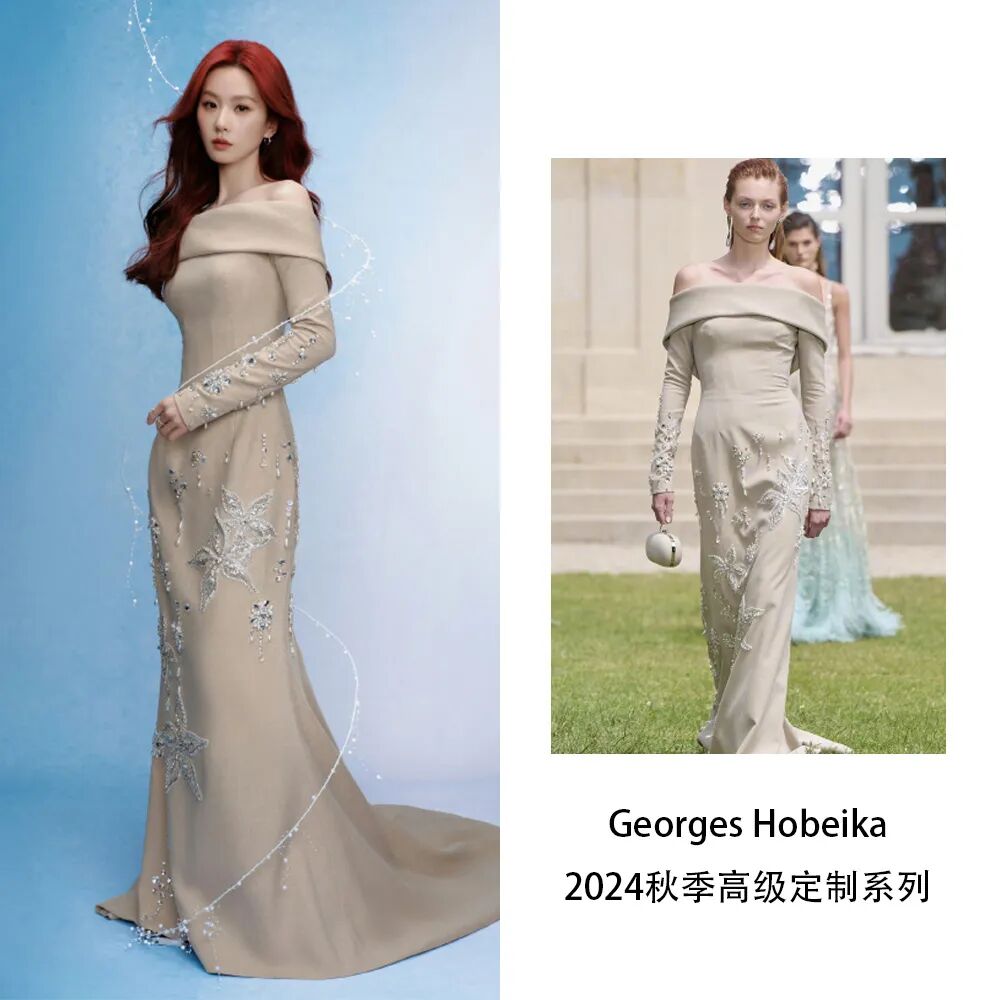 本周刘诗诗身着Georges Hobeika 2024秋冬高定系列、米色一字肩钉珠长裙出席活动,淡雅而唯美,搭配高饱和度红发,宛如美人鱼公主走入现实。