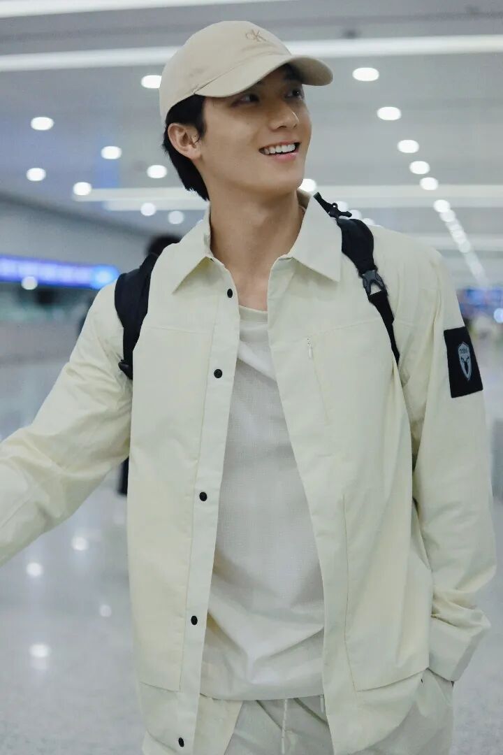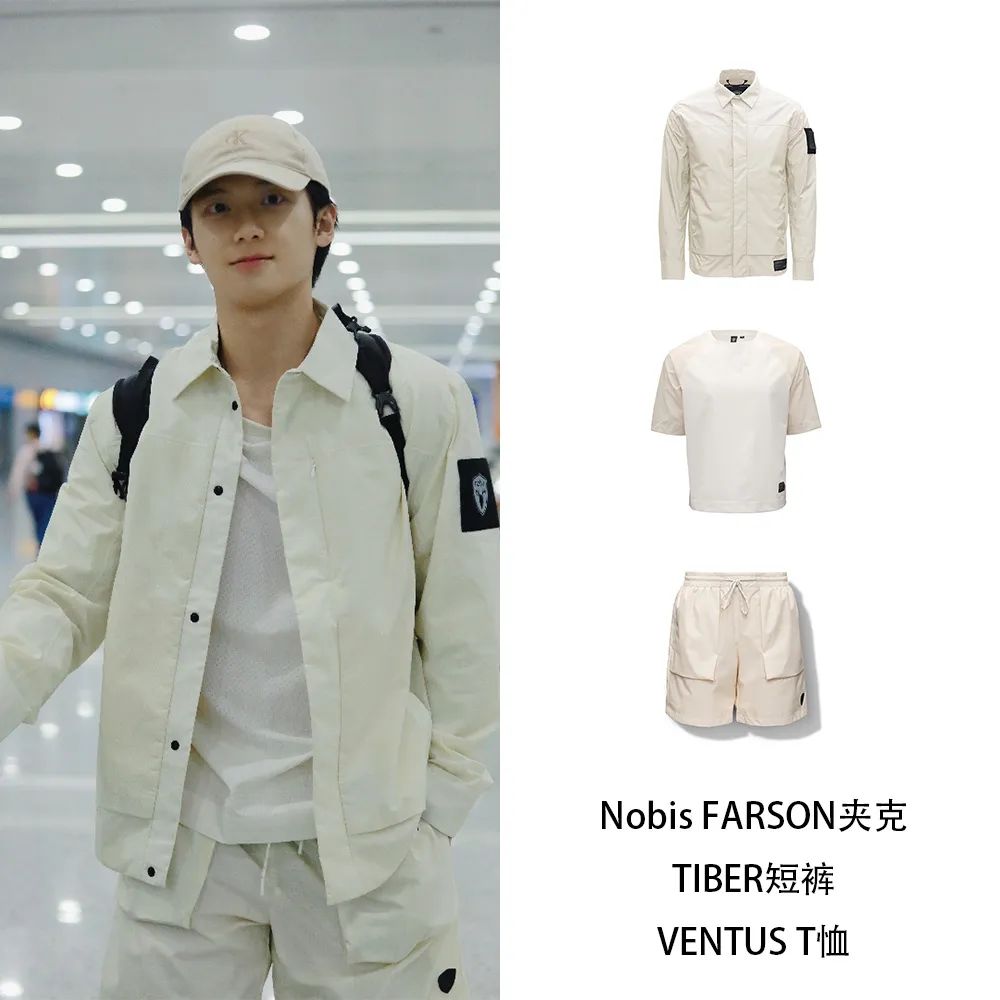不知道全白怎么搭?来看看吴汉坤在机场的演绎, 他身穿Nobis的整套搭配,FARSON夹克搭配TIBER短裤、VENTUS T恤,米色系穿搭与阳光型男适配度Max,轻松拿捏高分机场穿搭。