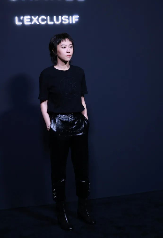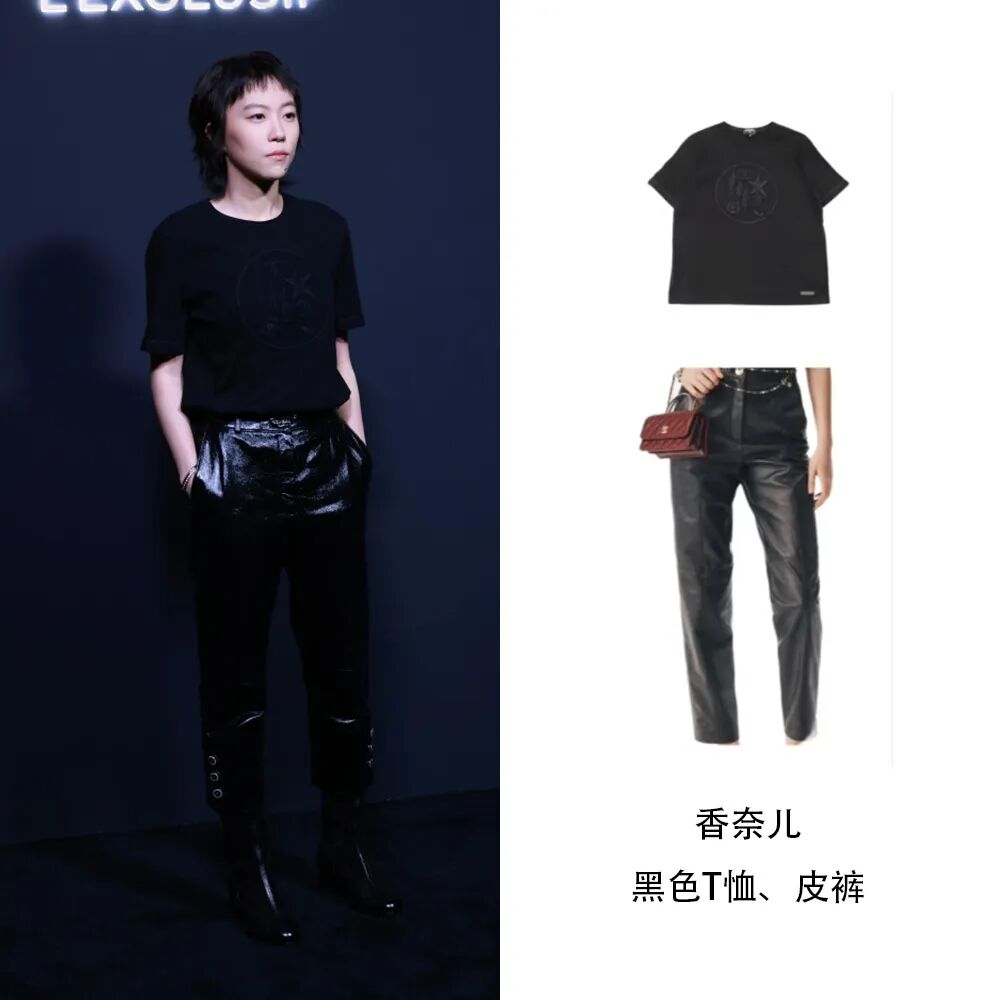 窦靖童依旧是我行我素风,简单的黑色短袖搭配漆皮长裤,非常特别,不同材质碰撞出不同的酷感,率性在她身上此刻具象化了。