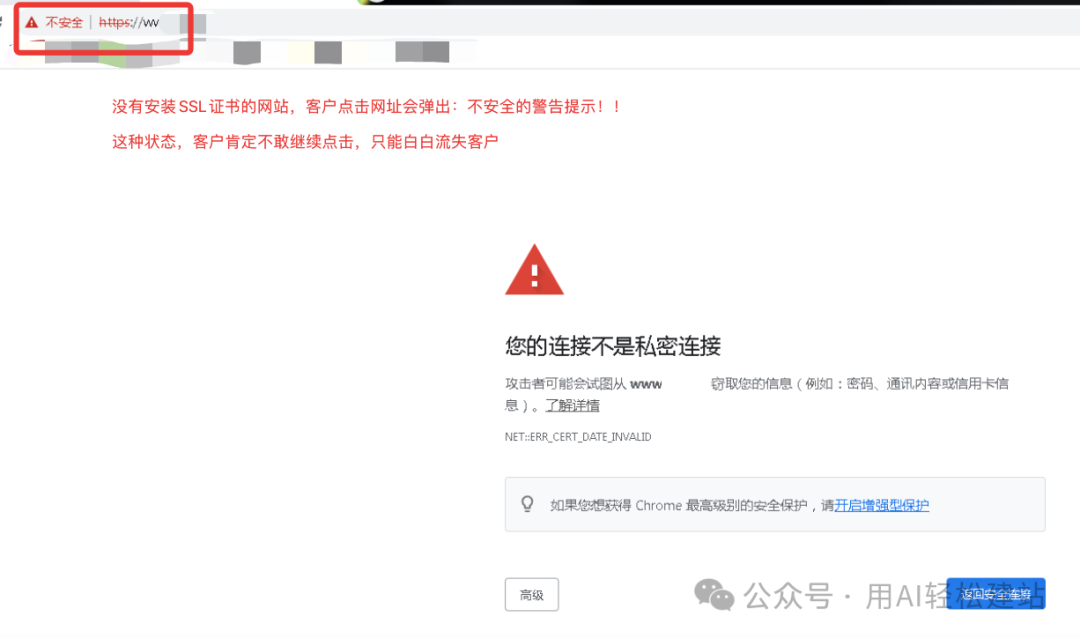 SSL安全证书,这个是网站标配来着。一是有利于保护的网站数据安全;二是可以消除浏览器不安全的提示,实现【https】开头的网址访问;三是有利于搜索引擎优化的,比如百度或谷歌这块,是会有这个硬条件要求,各大浏览器也是对部署证书的网站有优待哦~