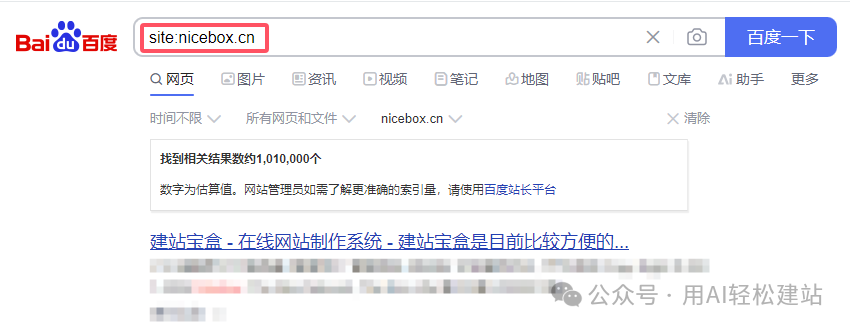 如site:nicebox.cn 就可以快速查看到网站的收录情况,如果没有收录会显示没有结果。