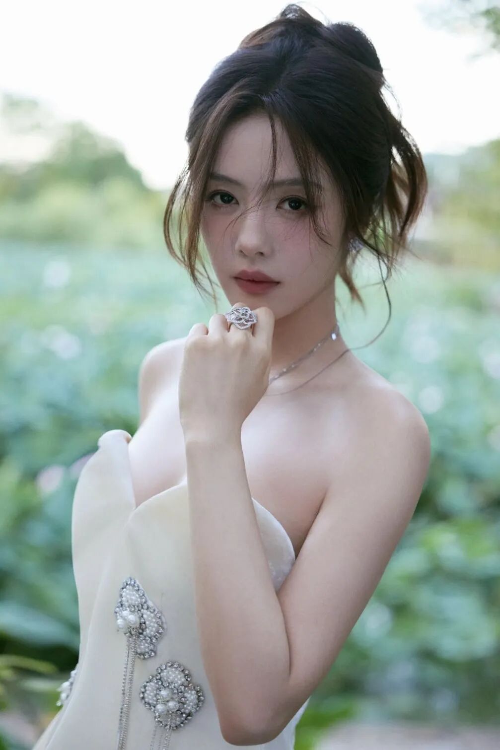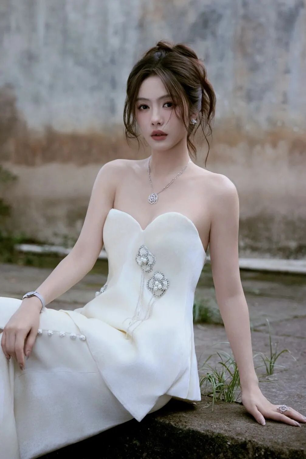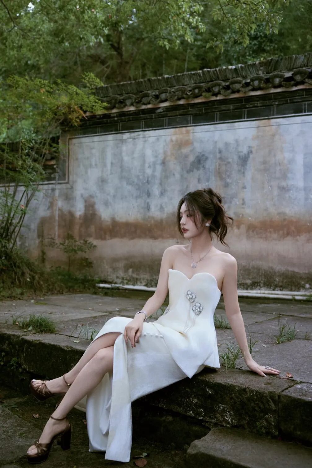 蔡文静这组照片直接美到失语!一袭白裙,又白又仙, 往那儿一站,真就应了 “濯清涟而不妖” 那句诗!抹胸设计衬得肩颈线条绝绝子。不管是托腮浅笑,还是静坐石阶, 那种清冷又温柔的气质,像从水墨画里走出来的。