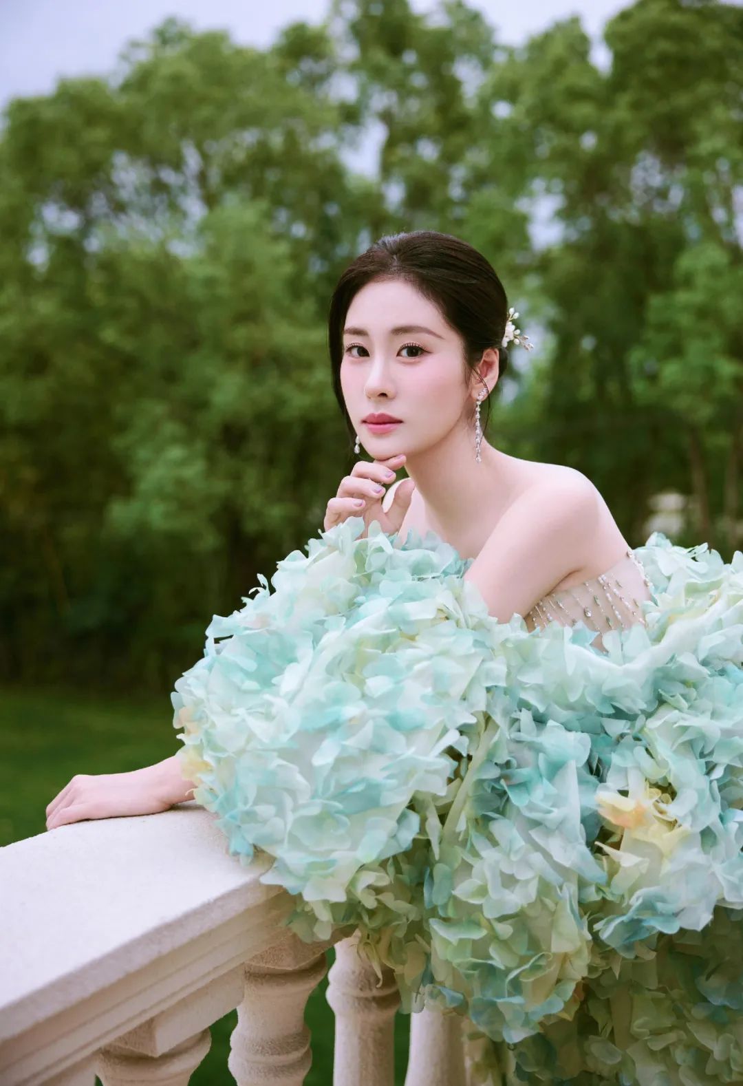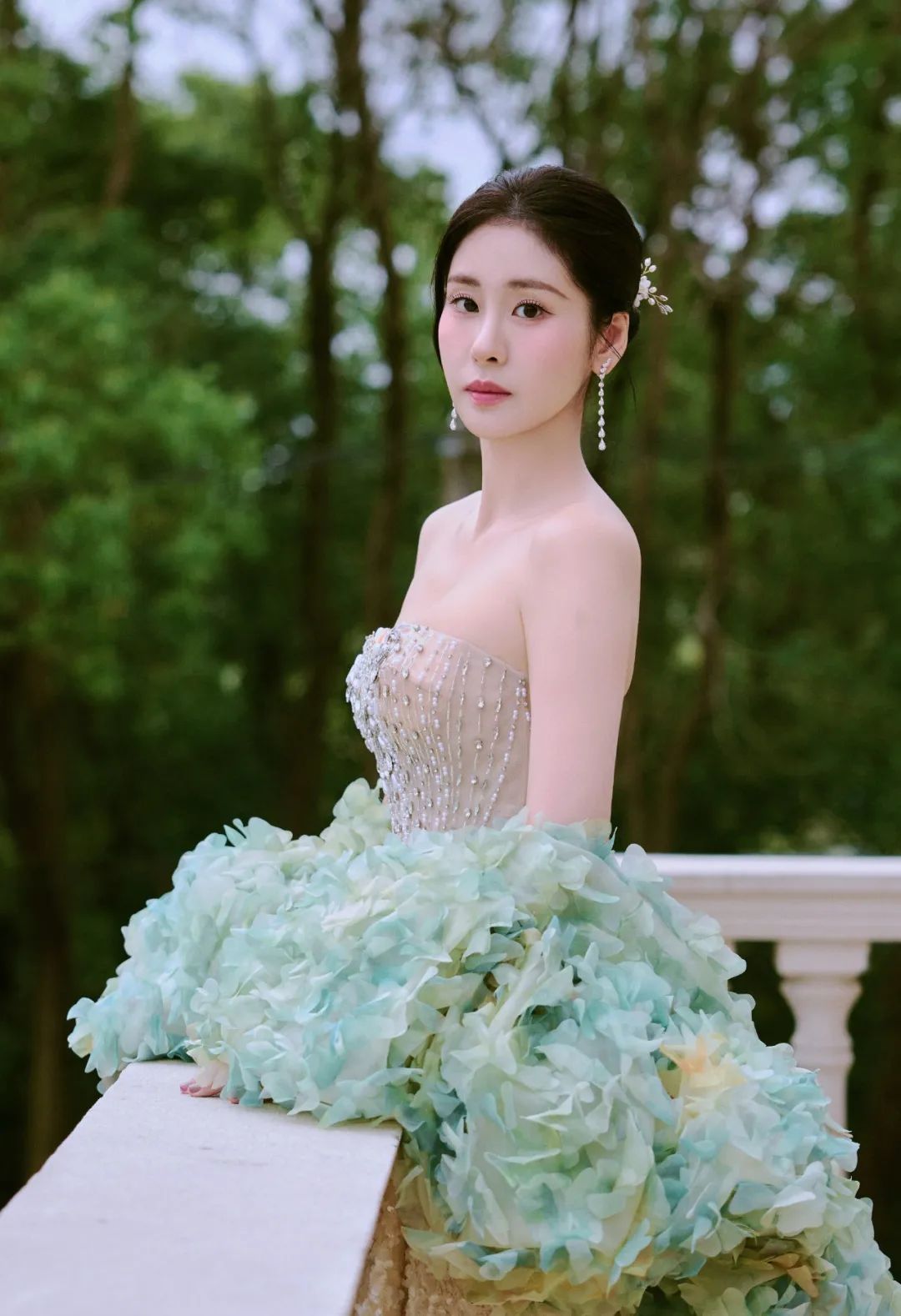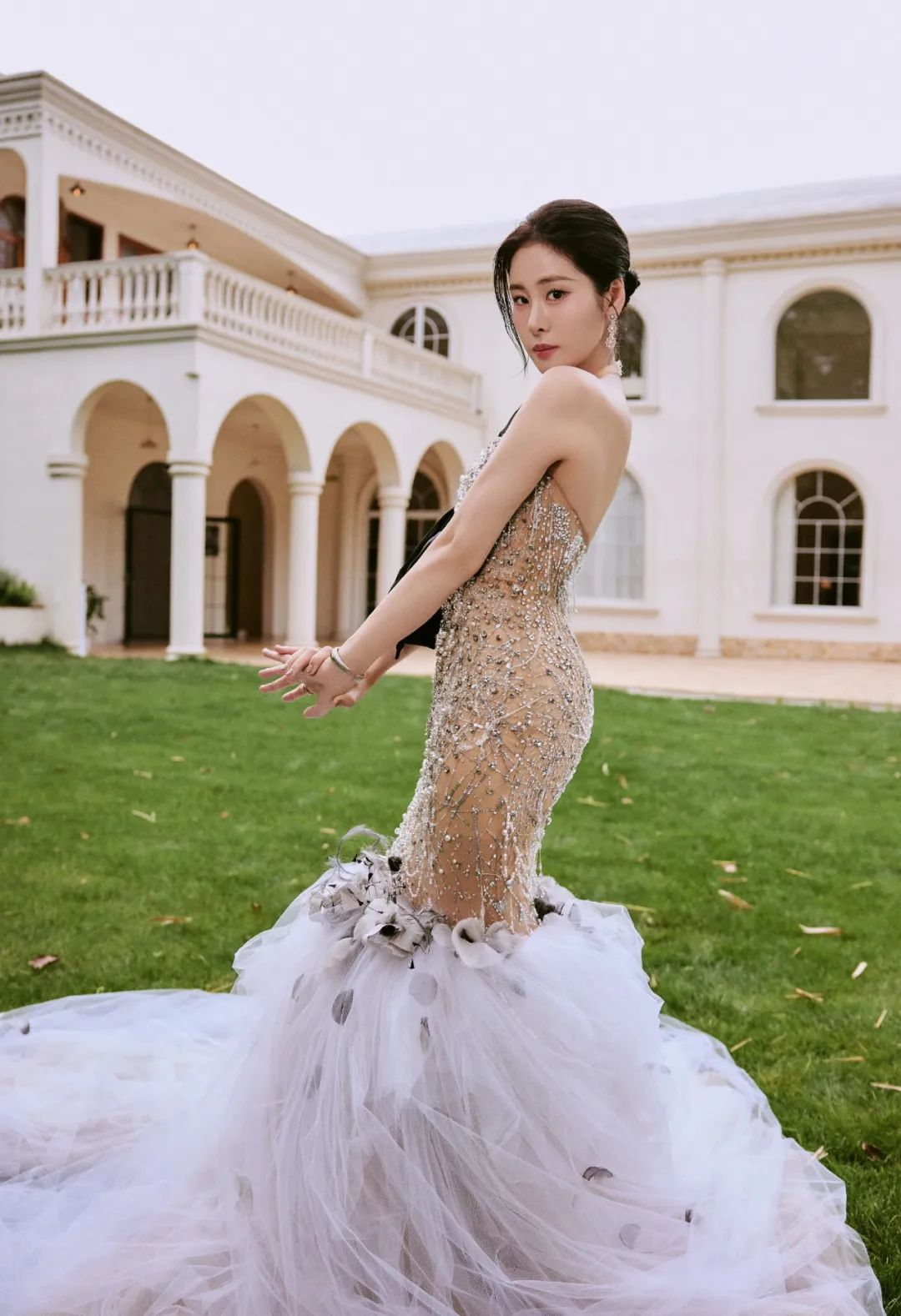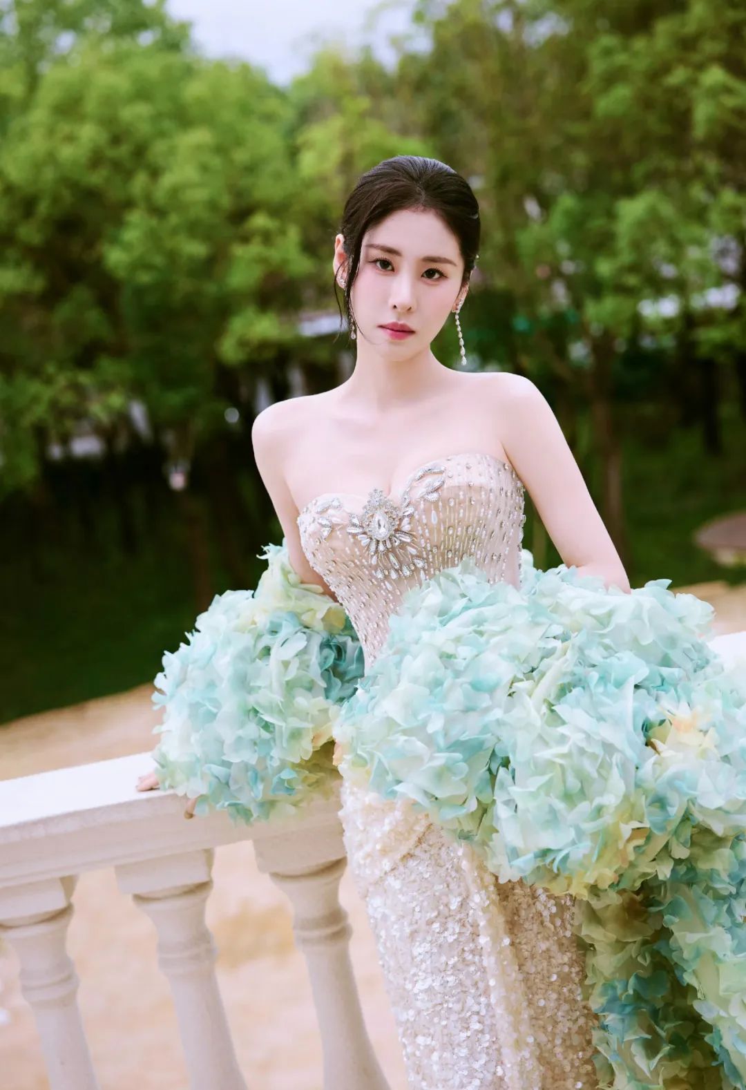 张碧晨身着抹胸鱼尾形礼服,上半身缀满闪亮水钻,勾勒精致肩颈与腰肢;裙摆是蓬松白纱,搭配羽毛装饰,华丽又浪漫,适配高端活动场景,尽显优雅大气 。