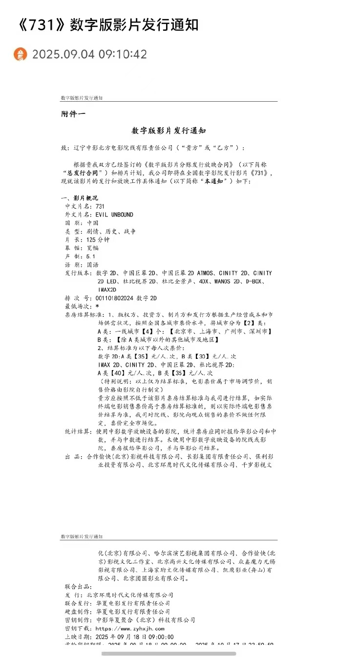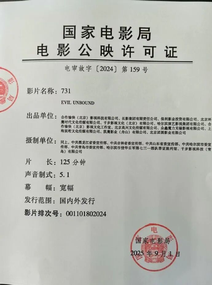 同时,《731》也已确定在港澳地区发行,将由银都机构有限公司、东方影业发行有限公司、洲立影片发行(香港)有限公司联手发行,上映日期将会很快公布。