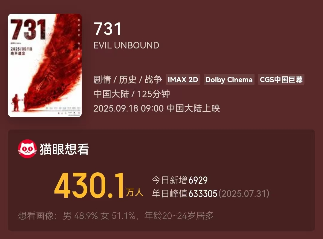 此刻,《731》在售票平台上的想看人数430万+,是仅次于《唐人街探案3》的中国影史第二的成绩。距离上映还有半个月时间,这个数字向上攀升乃至超越登顶的可能等也都存在。