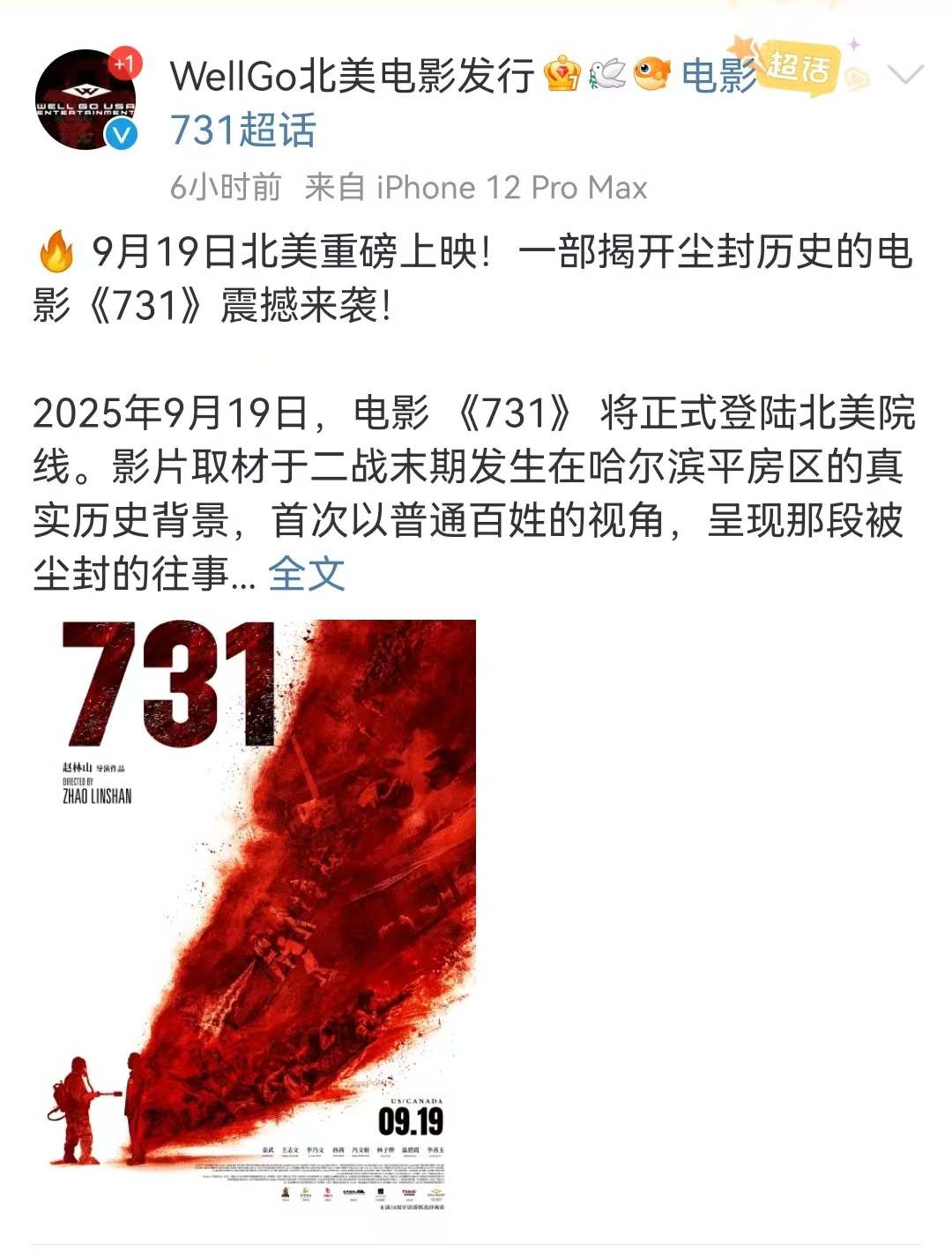 至于大家都很关心的海外发行问题,有一个好消息是:《731》北美地区定档9月19日上映,由WellGoUSA发行,该公司推宣传文中中还有演员与对应角色的介绍。