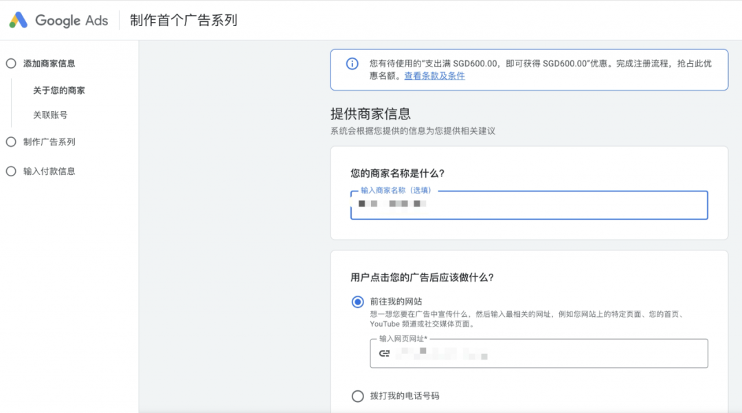 选择一个适合的套餐后点击 Start Now 就开始引导用户创建第一个广告账户了,如下图