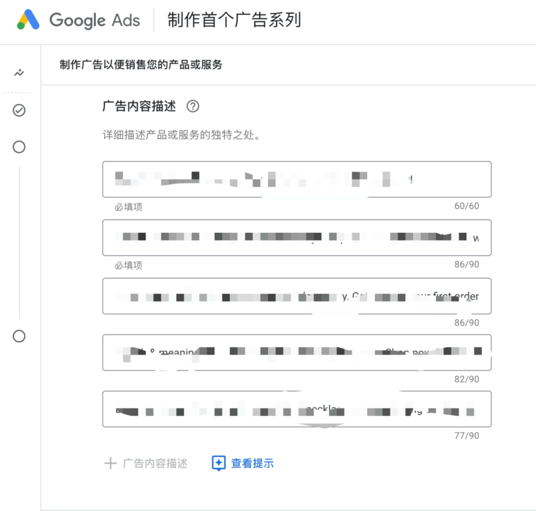 再下边就是广告内容描述,这里字数可以更多,多写几个,以便进行组合展示,如下图