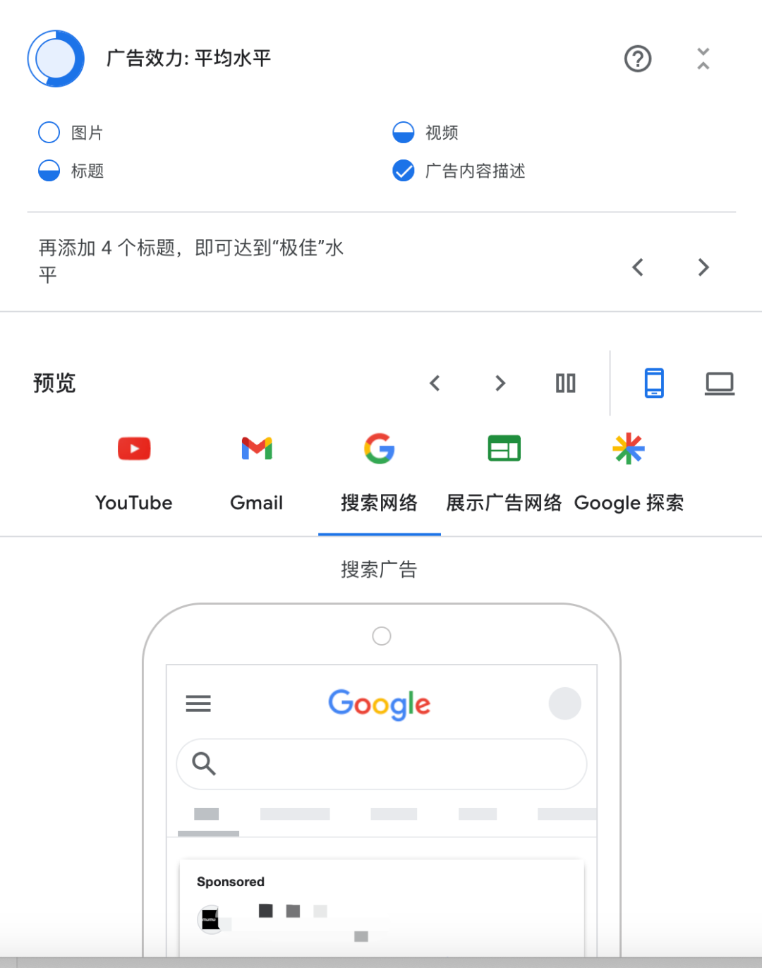 经过以上网站资料的上传填写,广告素材这一块基本就准备好了,右侧我们可以实时看到广告效力,根据提示进行完善,同是也可以看到网站素材的在不同平台(youtube, gmail, search 等)的预览效果,如下图