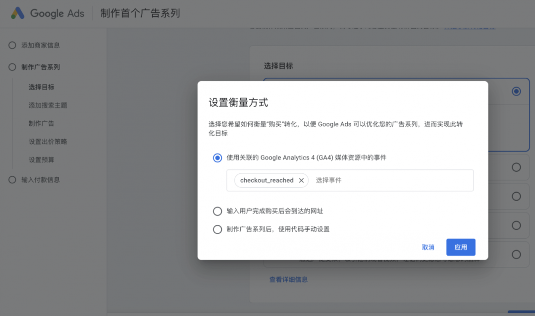 这里我选择我已经在 GA4 中建立的 checkout_reached 事件作为转化目标跟踪。点击下一步