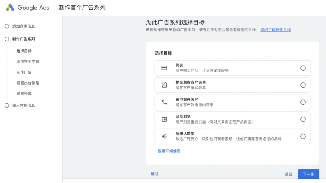 在制作广告系列这里首先需要我们确定广告目标,一般来说2C 的就是购买,2B的可以引导用户表单留资(leads),这里我选择了购买,然后下一步
