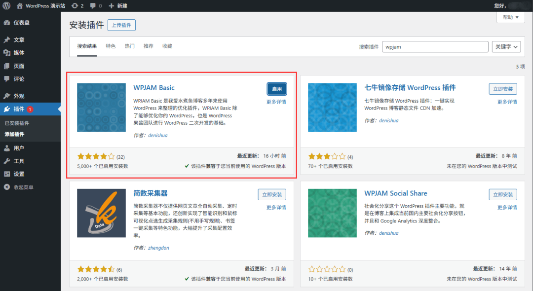 当然你还没有安装 WPJAM Basic 插件,可以直接在 WordPress 后台安装: