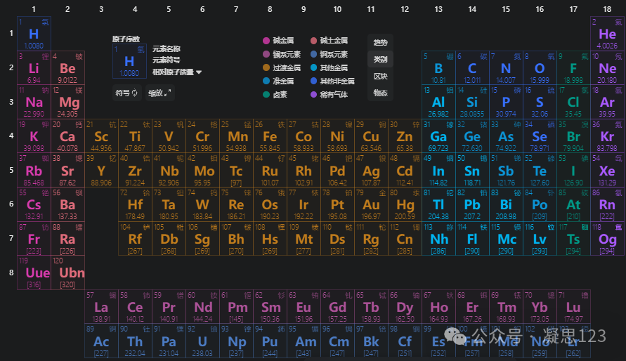 一个非常酷炫使用的元素周期表,按着类型分颜色,很鲜艳。