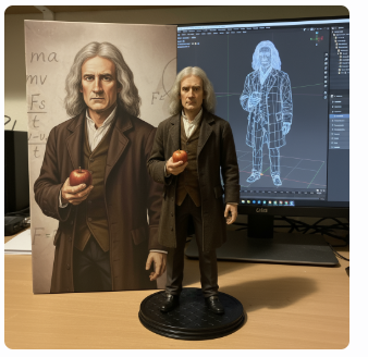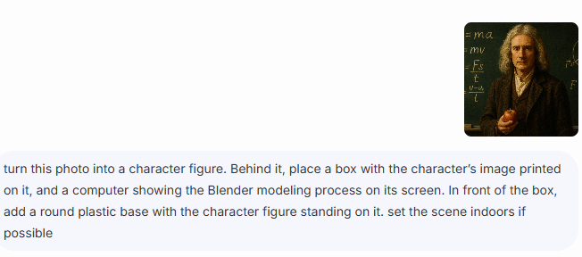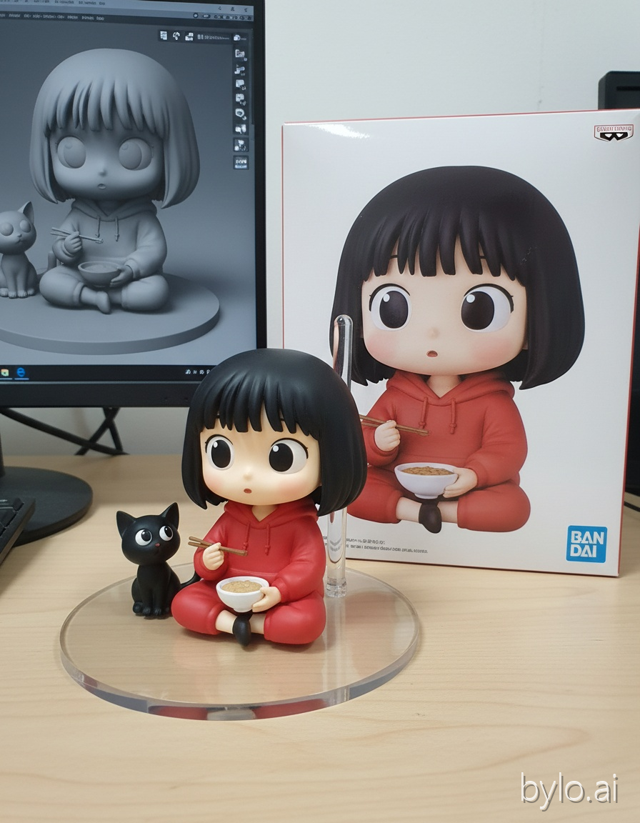 提示词:turn this photo into a character figure. Behind it, place a box with the character’s image printed on it, and a computer showing the Blender modeling process on its screen. In front of the box, add a round plastic base with the character figure standing on it. set the scene indoors if possible