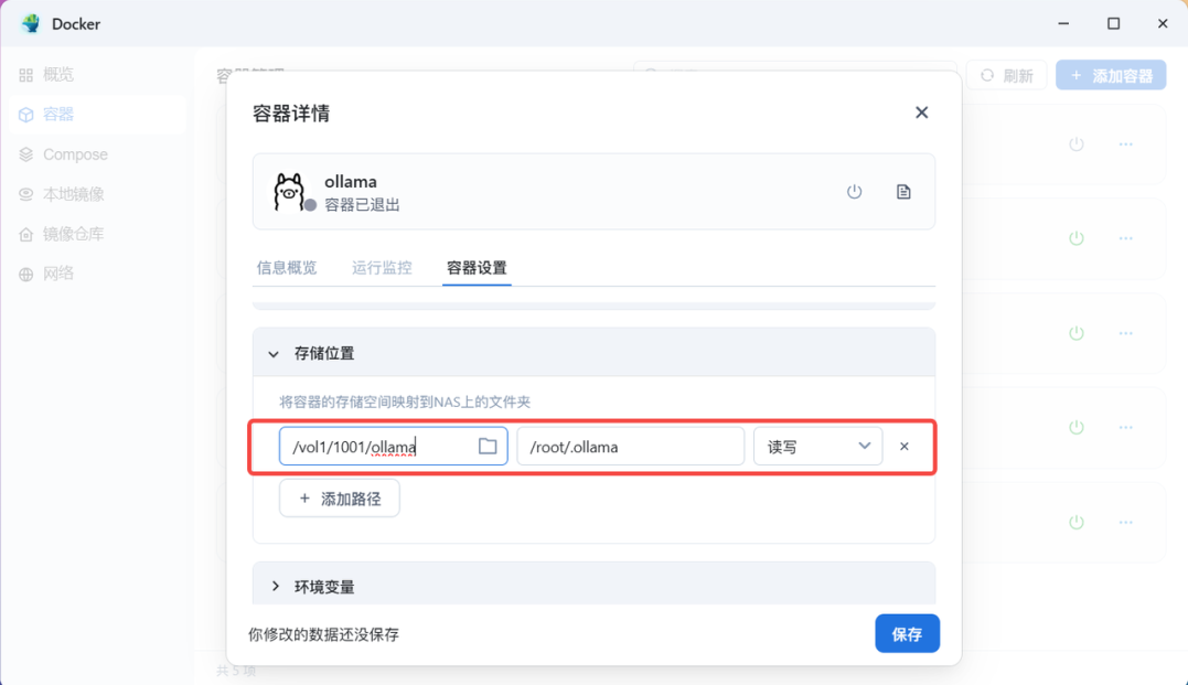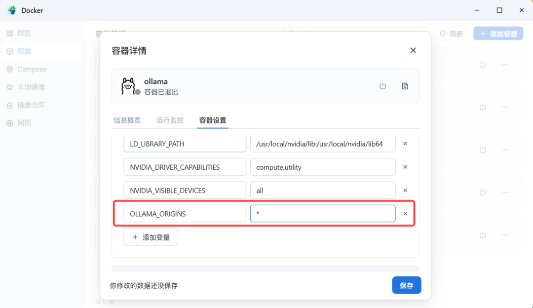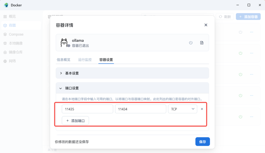 端口设置-输入外部访问的端口11435 容器内部端口11434(默认)