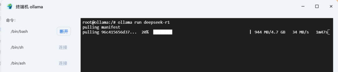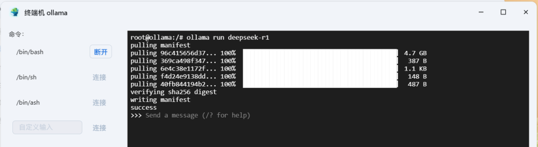 最后出现success,表示下载运行 deepseek-r1 成功!