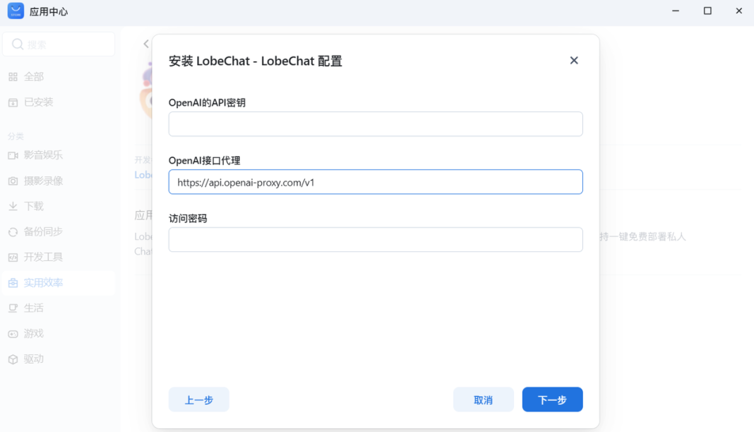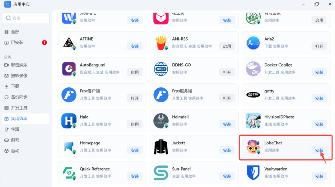 进入飞牛应用中心-实用效率-找到LobeChat点击安装