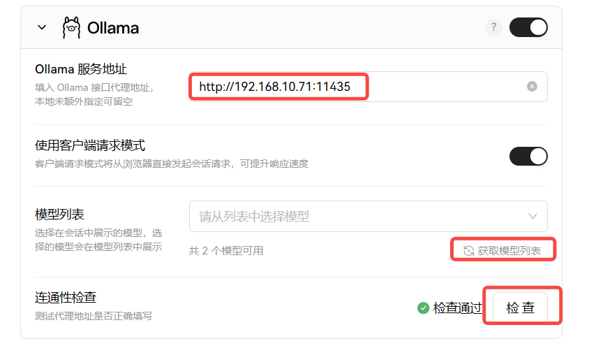 在服务地址输入 http://[你的局域网ip地址]:11435
