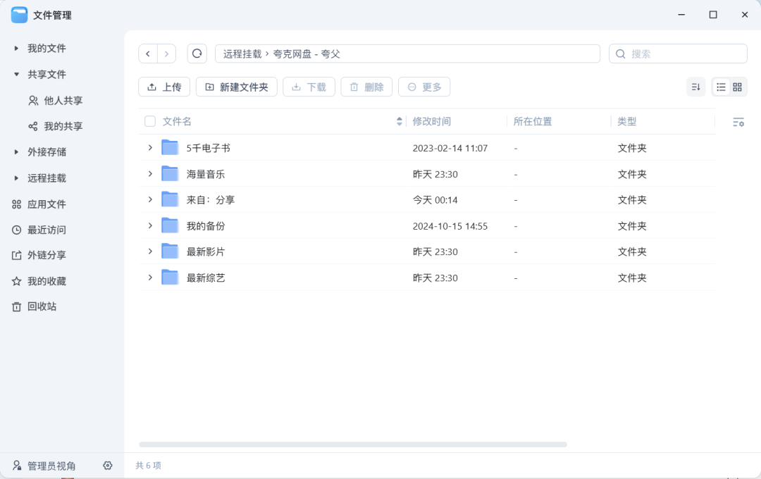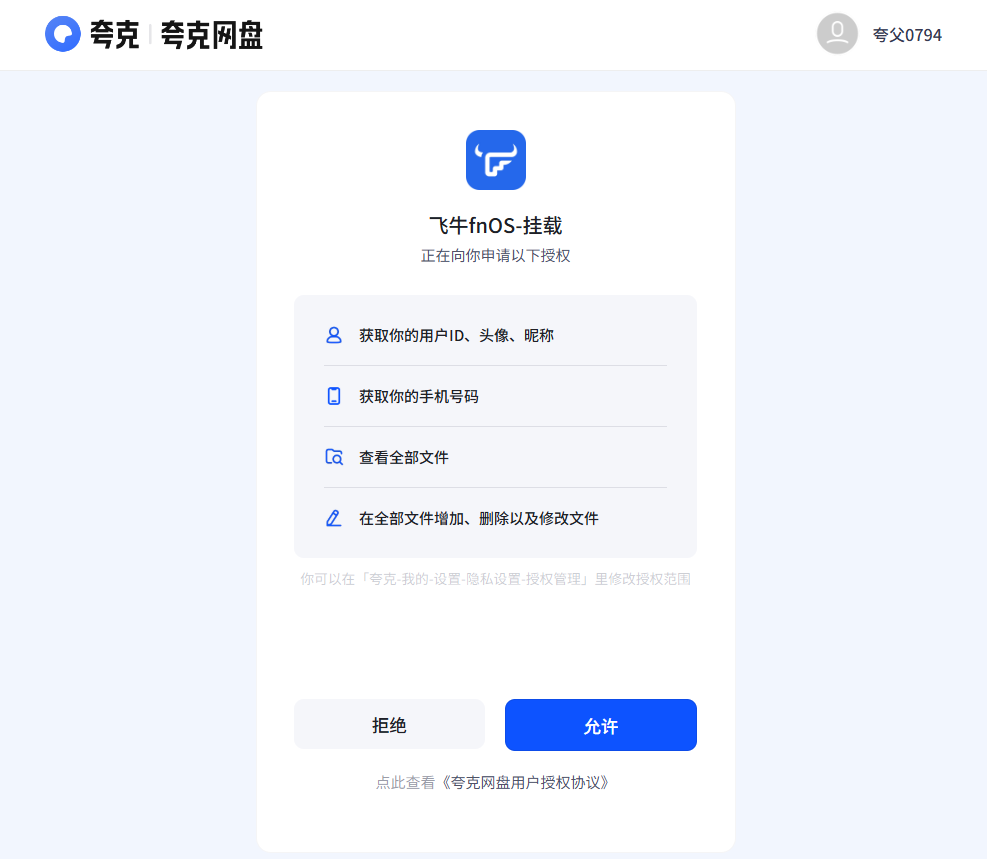 飞牛接入的方式,不依赖第三方工具,不用安装独立应用,将夸克网盘深度集成进 NAS 文件管理系统,实现真正的“本地化”挂载。