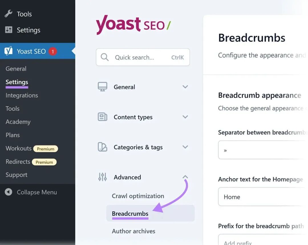之后,从侧边栏转到“Yoast SEO”>“Settings”。然后,选择“Advanced”>“Breadcrumbs”。