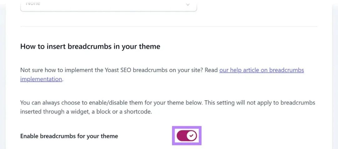 当您准备好实时推送更改时,请单击“Enable breadcrumbs for your theme”旁边的切换开关。