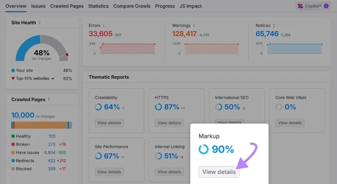 设置项目并扫描网站后,您将看到一个包含主题报告的仪表板。单击“Markup”下方的“View details”。