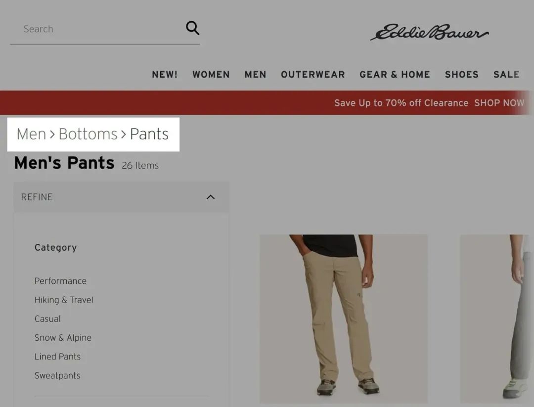 但是,痕迹导航不一定反映用户访问页面的旅程。例如,用户可以点击上面显示的 Eddie Bauer 男士裤子页面的直接链接。但他们仍然会看到相同的面包屑链接。