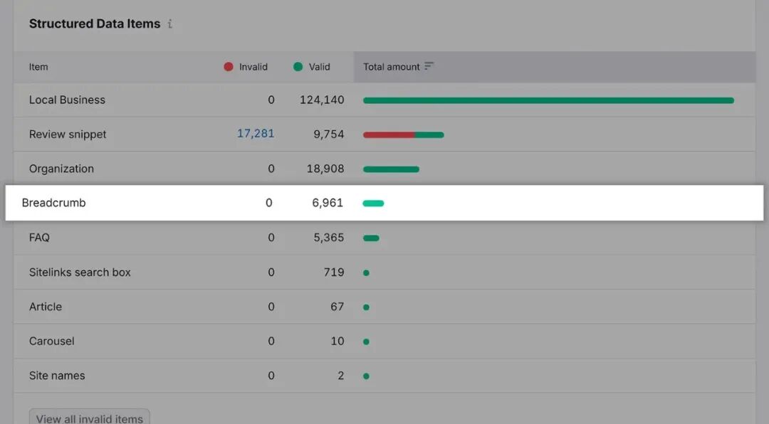 在“Structured Data Items”下,找到“Breadcrumb”。并检查“Invalid”列中是否有任何无效项目。