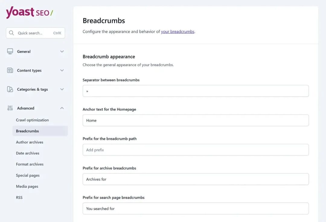 在这里,您可以配置痕迹导航并自定义它们在您的网站上的显示方式。
