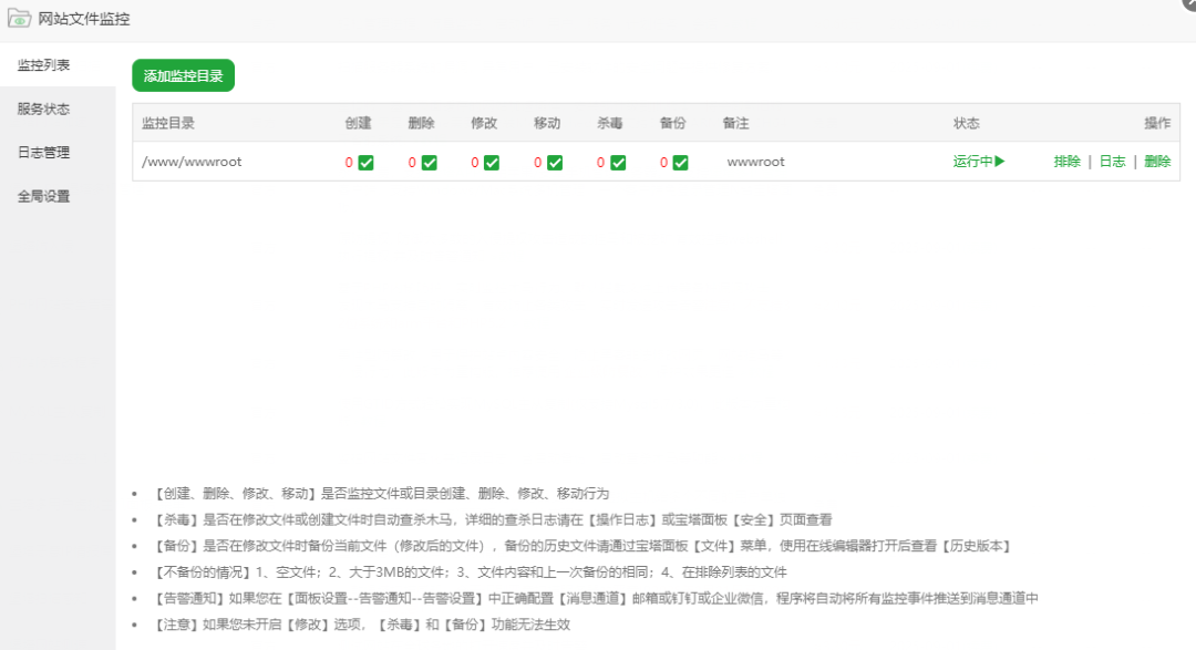 - 添加监控目录:您可以根据实际需求,选择监控站点列表中的特定目录。比如,您可以将网站的核心代码目录、配置文件目录等添加到监控列表中,确保这些重要文件的安全。