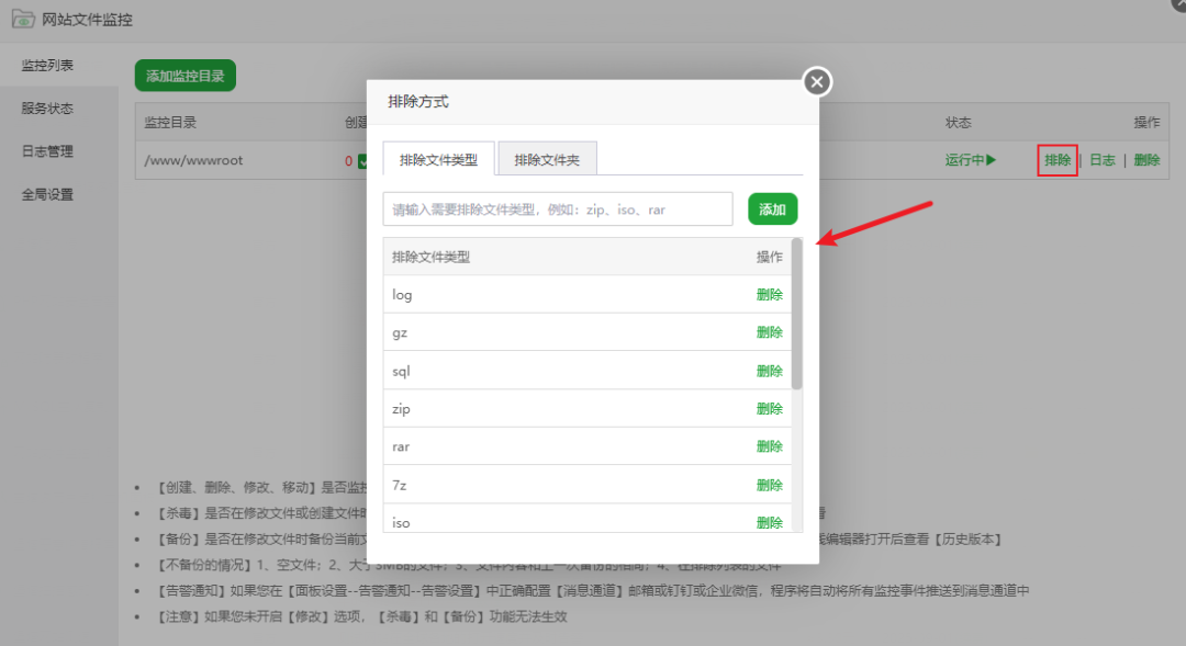 - 排除功能:考虑到服务器磁盘空间的限制,如果对所有文件都进行备份,可能会导致磁盘不够用。插件提供了排除功能,你可以按照文件类型、文件夹名称进行排除。被排除的文件类型或排除的文件夹里的文件将不再被监控,这样既能节省磁盘空间,又能确保重点文件得到监控。