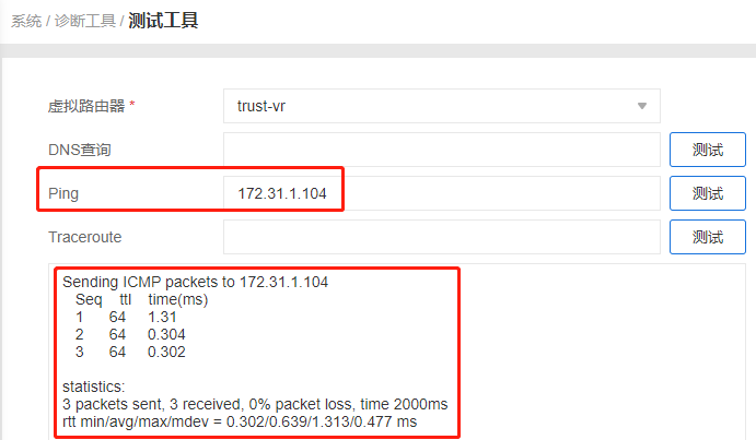 在【系统→诊断工具→测试工具】下,Ping测试到vCPE主机的内网IP地址的可达性。