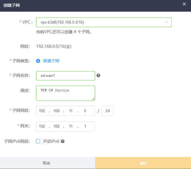 新建一个192.168.11.0/24的子网1绑定VPN网关公网接口,以提供服务。