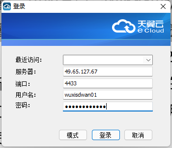 其中【服务器】为VPN网关的公网IP地址,本例中为49.65.127.67;【端口】为SSL VPN的服务端口,本例中为4433;【用户名】和【密码】对应用于登录SSL VPN的本地用户。