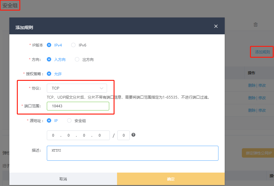 在主机安全组中放行TCP 10443端口,用于防火墙的HTTPS页面登录。