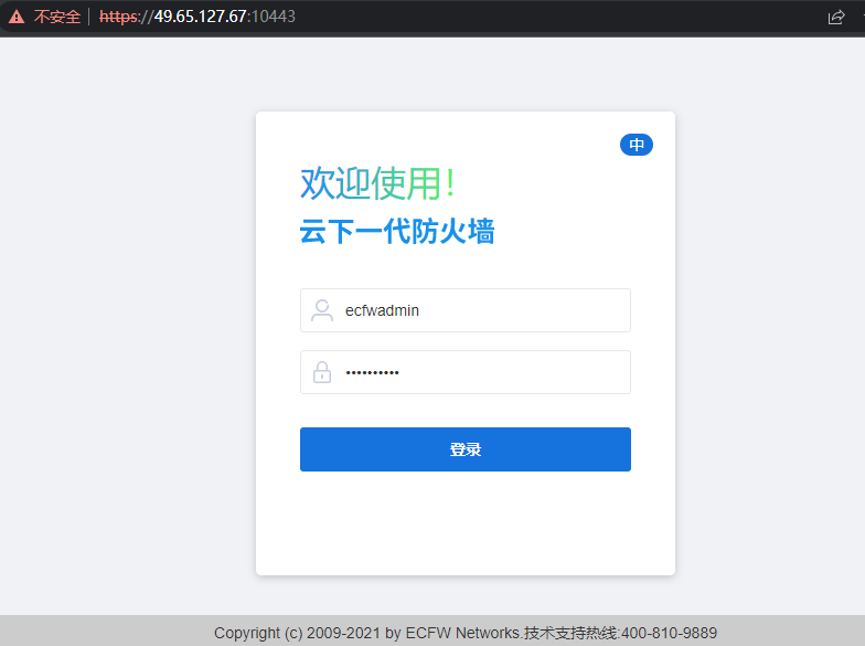 登录防火墙管理页面,默认登录地址为:https://弹性IP:10443,默认登录账号密码为ecfwadmin/ecfw189@#! 。