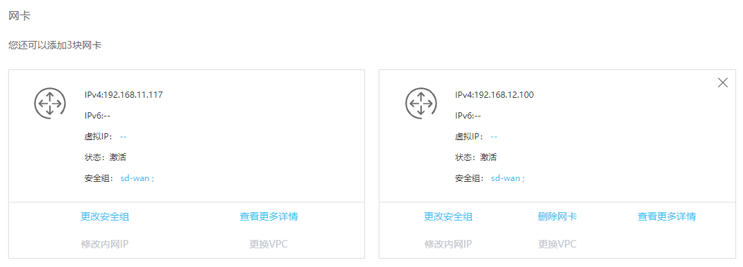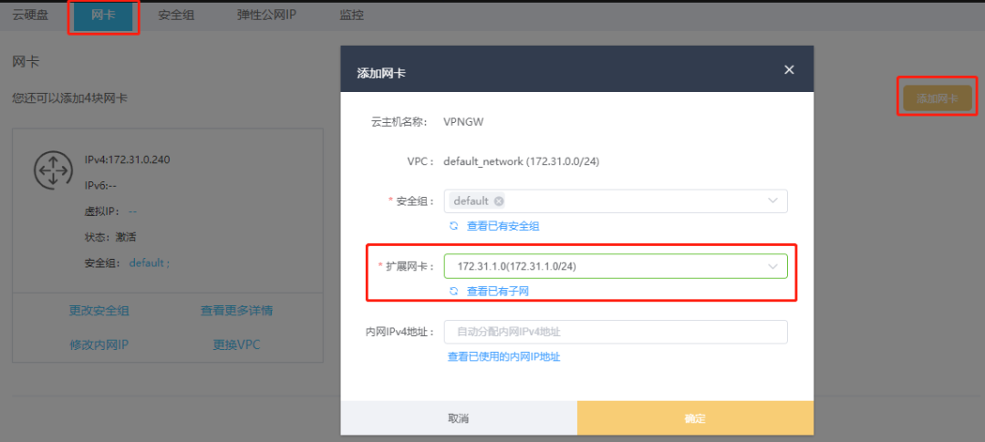 给防火墙添加第二块网卡,子网选择新建的VPC子网,用于和vCPE通信。