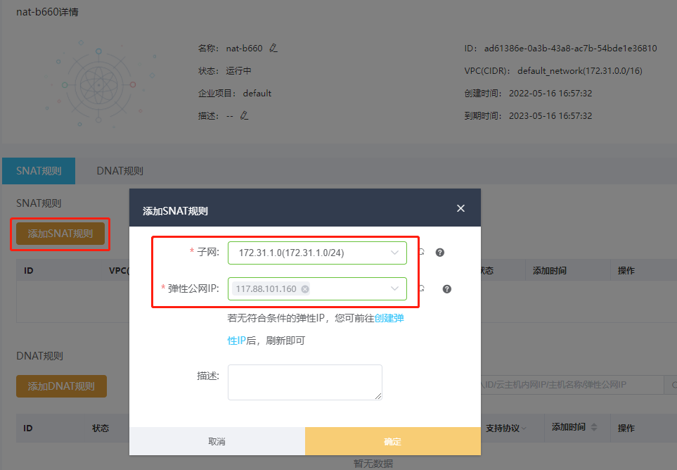 点击【添加SNAT规则】,确认子网信息和弹性公网IP信息。