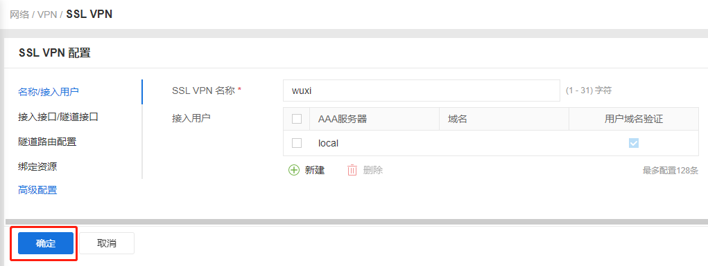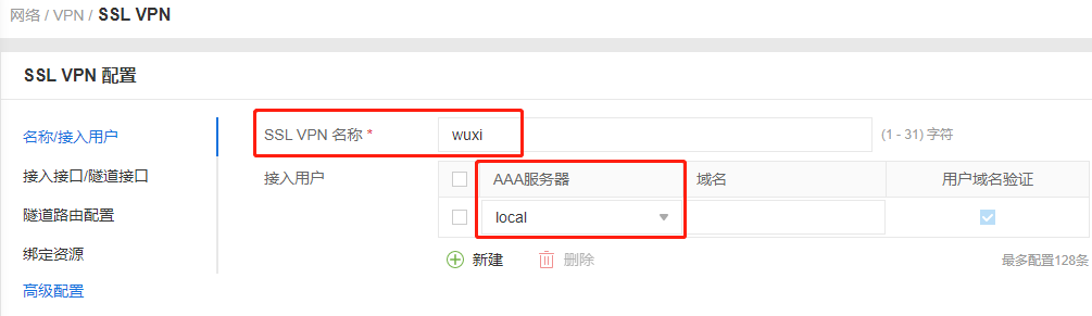 【名称/接入用户】配置中,配置一个VPN名称,接入用户AAA服务器选择local。