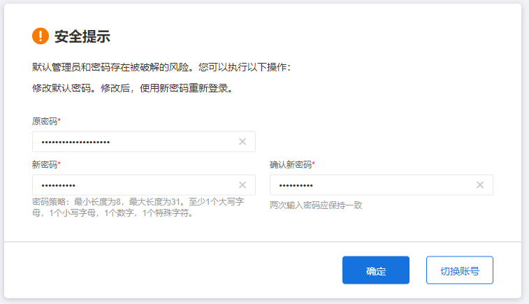 登录之后会要求修改默认密码。新密码需要满足密码策略要求:最小长度为8,最大长度为31。包含至少1个大写字母,1个小写字母,1个数字,1个特殊字符。