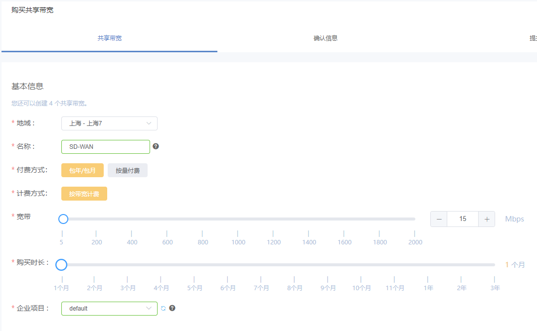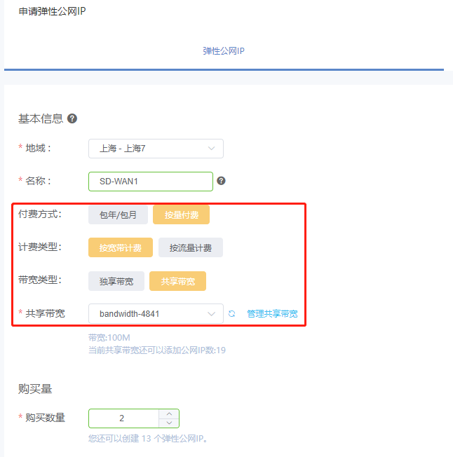 申请公网IP地址,付费方式选择【按量付费】,带宽类型选择【共享带宽】,并选择到刚才创建的共享带宽。