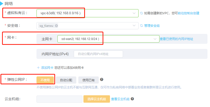 网络配置中,虚拟私有云及网卡选择到新建的子网2,不使用弹性公网IP。