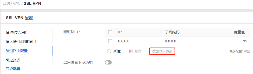 【隧道路由配置】中,点击【添加默认路由】,当用户拨号成功后,为用户下发默认路由。