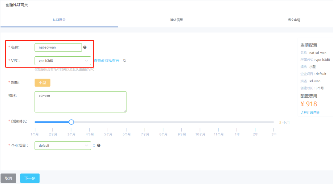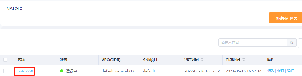 在上海7创建一个NAT网关,使vCPE主机通过共享带宽访问互联网,避免公网IP直连的安全风险,注意绑定正确的VPC。