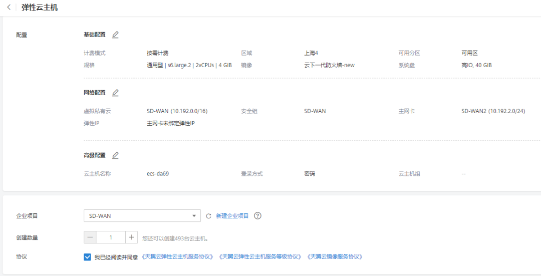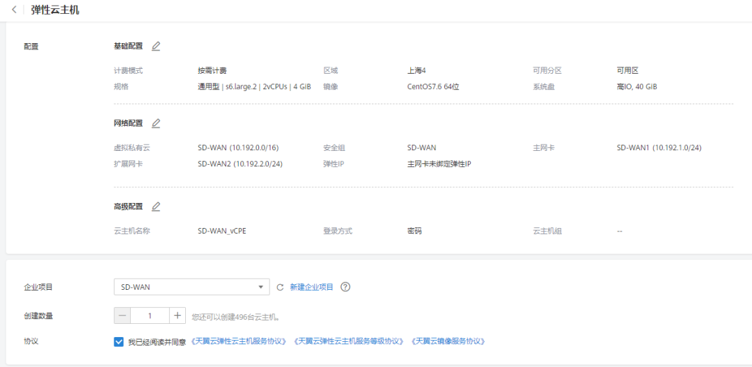 在上海7开通2台云主机,其中一台用于部署vCPE云主机。主机配置为:2核CPU、4 GB内存、40 GB系统磁盘,镜像选择【公共镜像】→【Linux】→【CentOS7.6】。