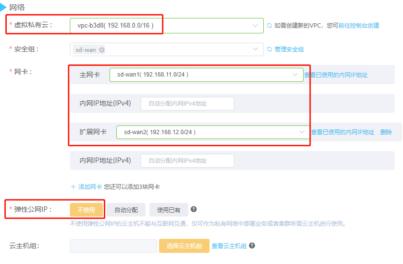 网络配置中,主网卡选择到新建的子网1,扩展网卡选择到新建的子网2,不使用弹性公网IP。