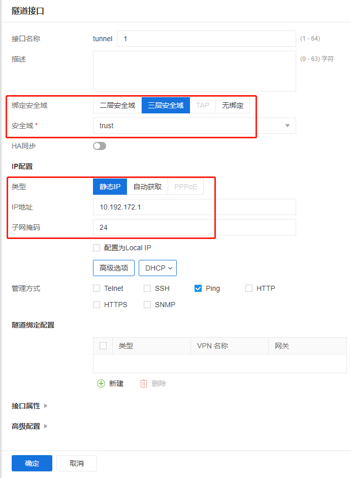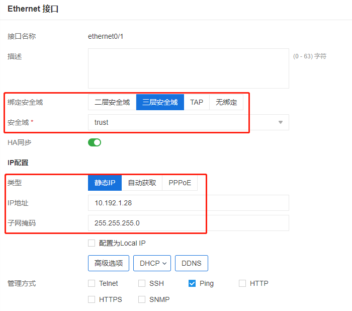 修改ethernet0/1接口配置,绑定到【三层安全域-trust】,关闭【HA同步】,并配置分配的IP地址信息。
